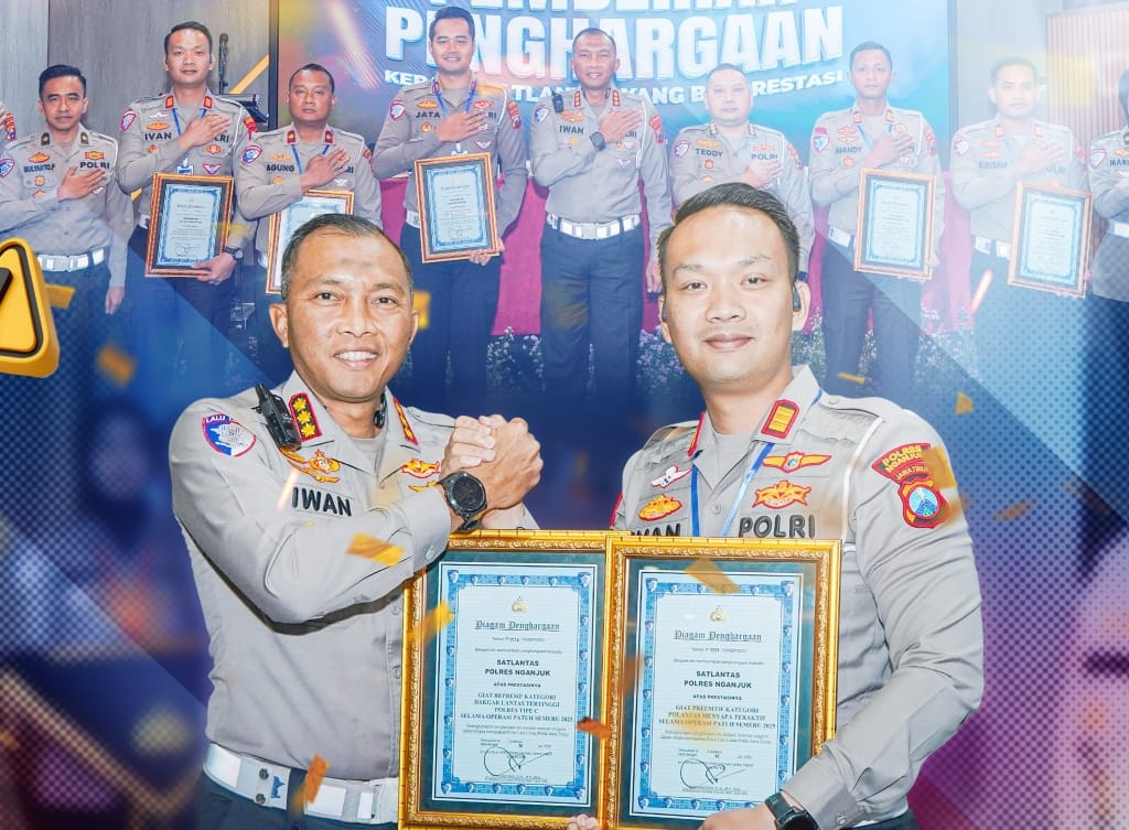 Penghargaan tersebut diserahkan langsung oleh Dirlantas Polda Jatim, Kombes Pol Iwan Saktiadi, S.I.K., M.H., M.Si., sebagai bentuk apresiasi atas kinerja luar biasa Satlantas Polres Nganjuk selama pelaksanaan Operasi Patuh Semeru 2025 dan Operasi Lilin Semeru 2024.