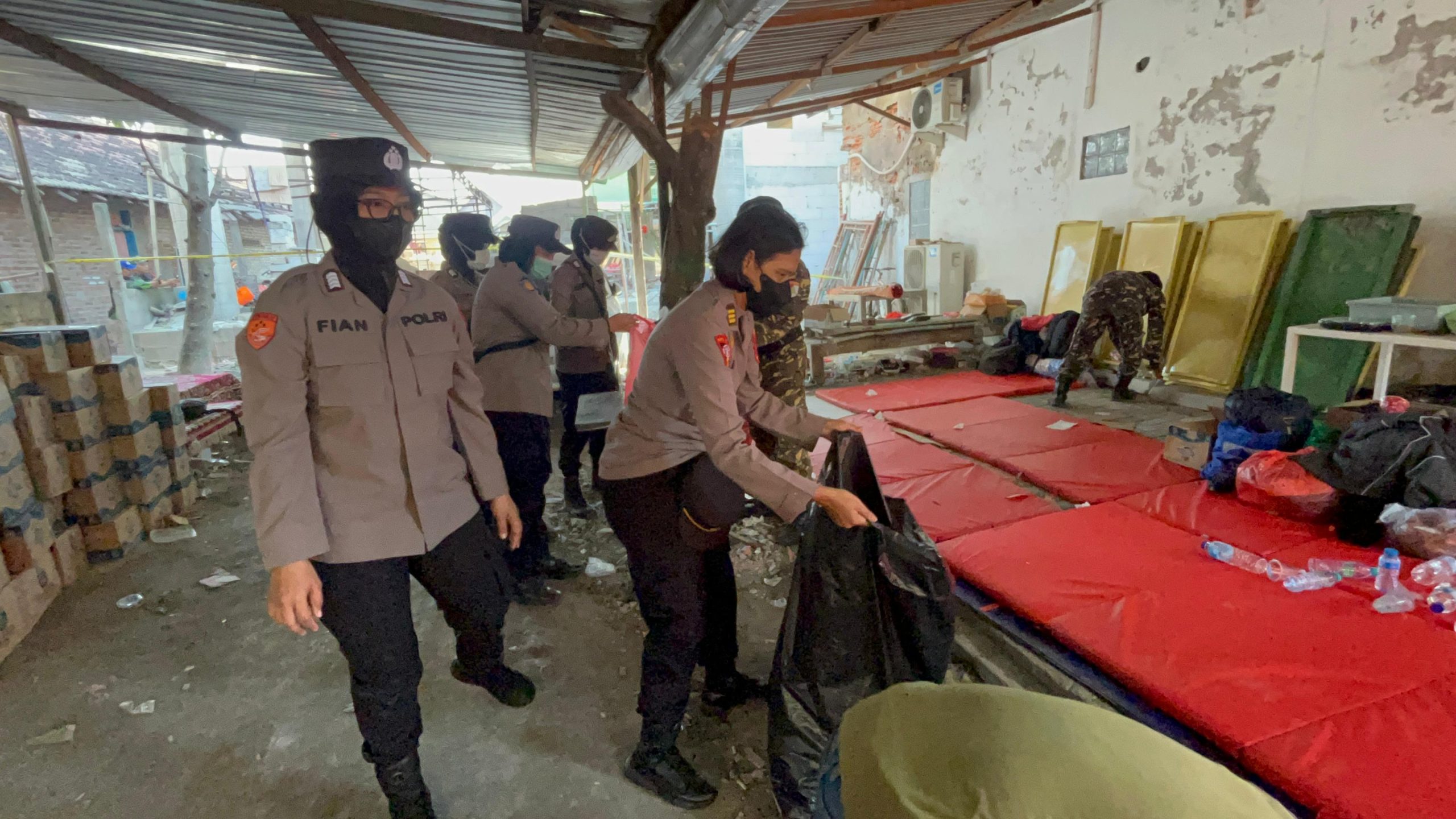 Tidak hanya fokus pada tugas pengamanan jalannya proses evakuasi reruntuhan bangunan Pondok Pesantren (Ponpes) Al Khoziny, Buduran, Polisi Wanita (Polwan) Polresta Sidoarjo juga menunjukkan kepeduliannya dengan ikut membantu menjaga kebersihan di posko keluarga korban, Jumat (3/10/2025).