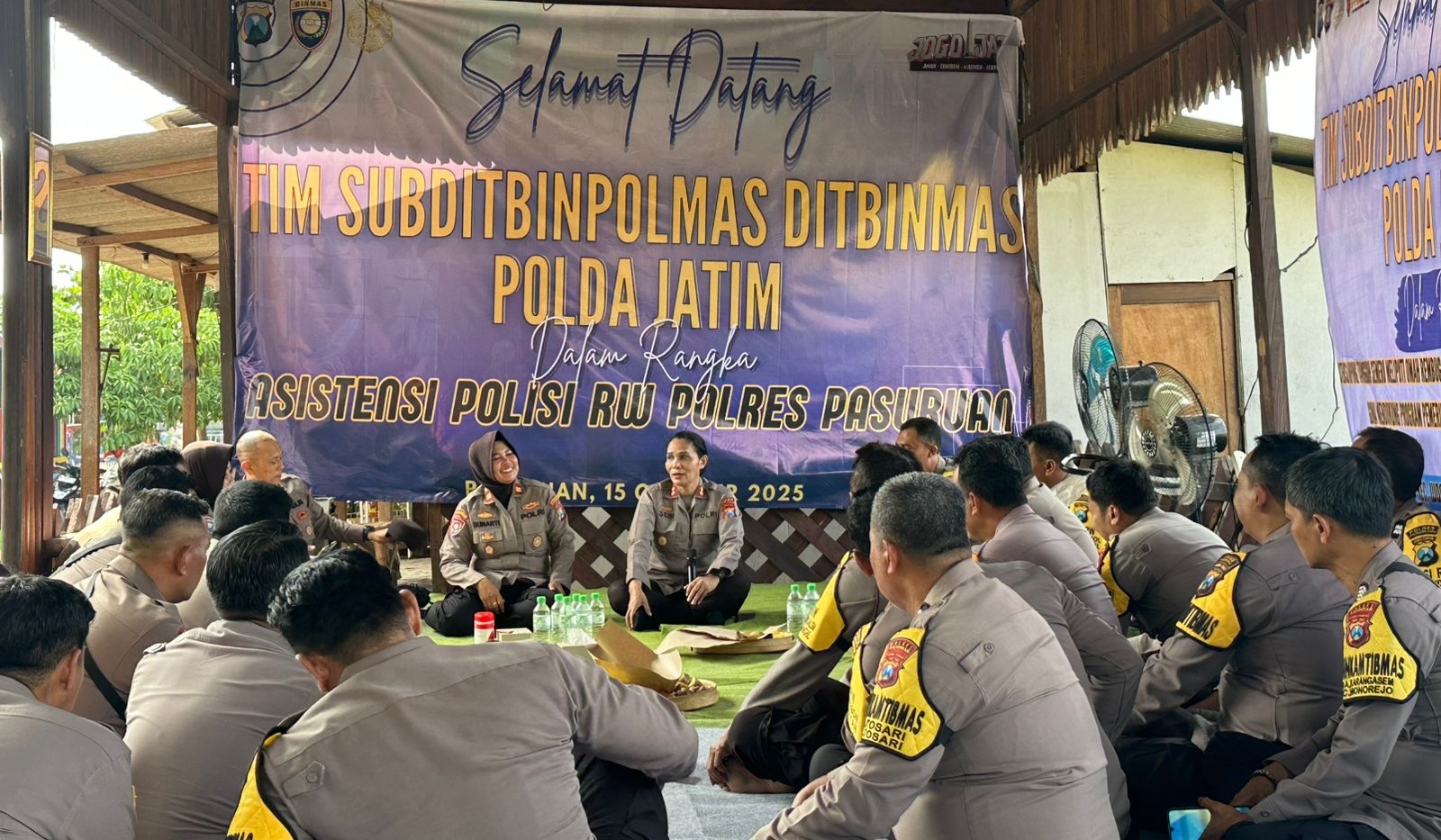 Direktorat Binmas Polda Jawa Timur melalui Tim Subditbinpolmas melaksanakan kegiatan Asistensi Kampung Tangguh Semeru (meliputi P2B, Polisi RW, dan Omah Rembug) di Alun-alun Desa Karangsono, Kecamatan Wonorejo, Kabupaten Pasuruan, pada Rabu (15/10/2025).
