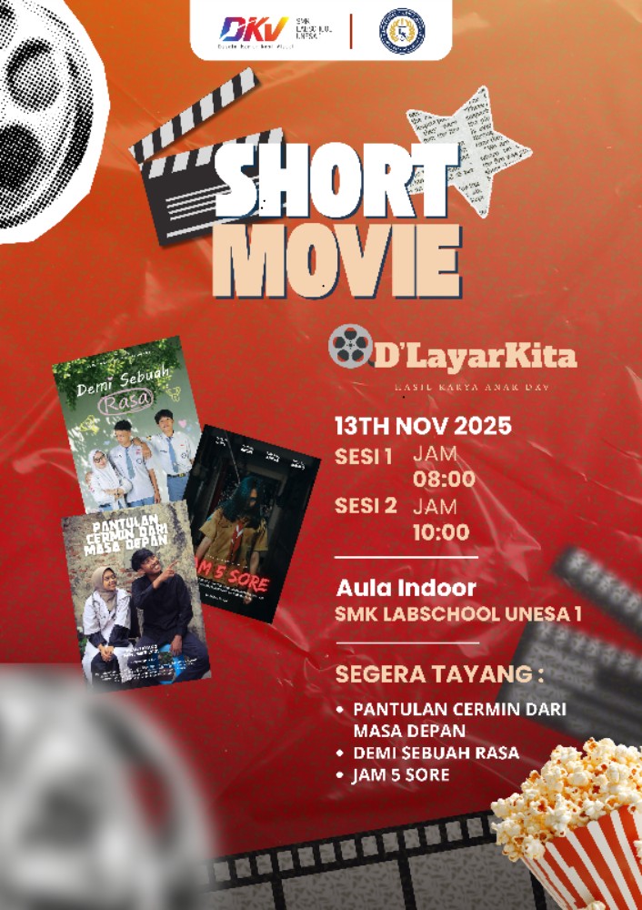 SMK LABSCHOOL UNESA 1 kembali menunjukkan komitmennya dalam memberikan ruang berekspresi dan berkarya bagi para siswanya. Pada 13 November 2025, Program Keahlian Desain Komunikasi Visual (DKV) sukses menggelar acara bertajuk “D’LayarKita”, sebuah pemutaran film pendek yang diproduksi oleh seluruh siswa/i kelas XII DKV.