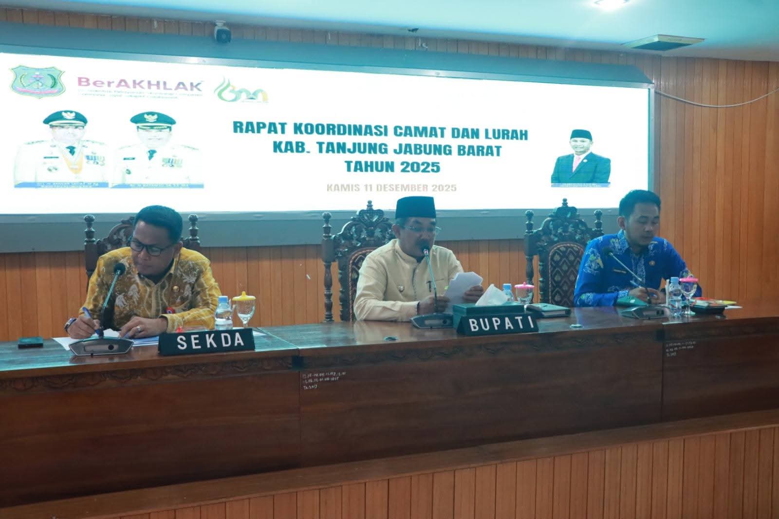 Bupati Tanjung Jabung Barat (Tanjab Barat), Drs. H. Anwar Sadat, M.Ag., menekankan pentingnya peran camat dan lurah sebagai ujung tombak pelayanan publik dalam Rapat Koordinasi (Rakor) Camat dan Lurah se-Kabupaten Tanjung Jabung Barat yang digelar di Ruang Pola Utama Kantor Bupati, Kamis (11/12/2025).