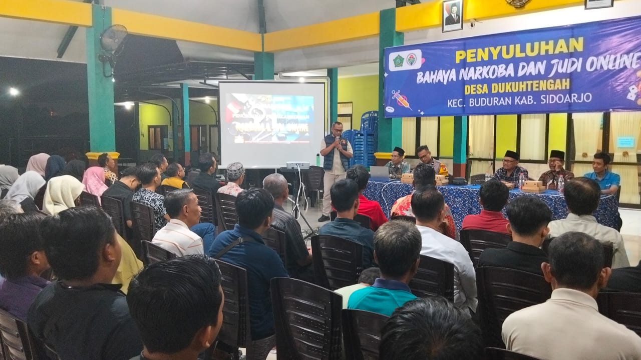 Guna mencegah penyalahgunaan narkoba serta maraknya praktik judi online di tengah masyarakat, Polsek Buduran Polresta Sidoarjo melalui Kanit Reskrim Iptu Juju Prasetyo bersama Bhabinkamtibmas Desa Dukuh Tengah Aiptu Syaiful Rochman menggelar kegiatan penyuluhan kepada warga Desa Dukuh Tengah, Kecamatan Buduran, Kabupaten Sidoarjo, Jumat (19/12/2025).