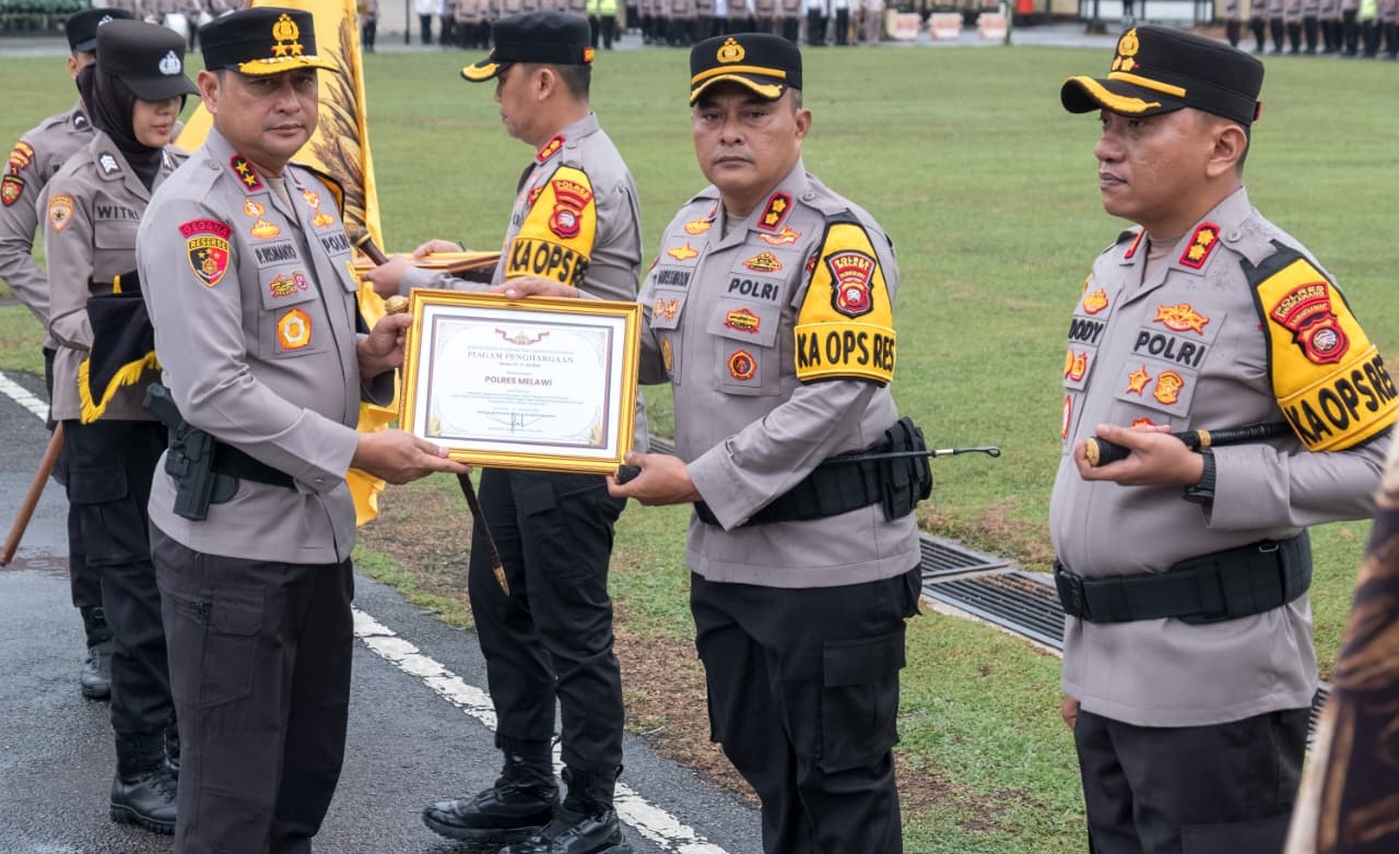 Kapolres Melawi AKBP Harris Batara Simbolon, S.I.K., S.H., M.Tr.Opsla menerima Piagam Penghargaan atas prestasi Polres Melawi yang berhasil meraih Juara 2 dalam pencapaian target tertinggi penanaman lahan pada Program 2 Pemanfaatan Lahan Produktif Gugus Tugas Polri Mendukung Ketahanan Pangan Polda Kalbar periode Januari hingga Februari 2026.