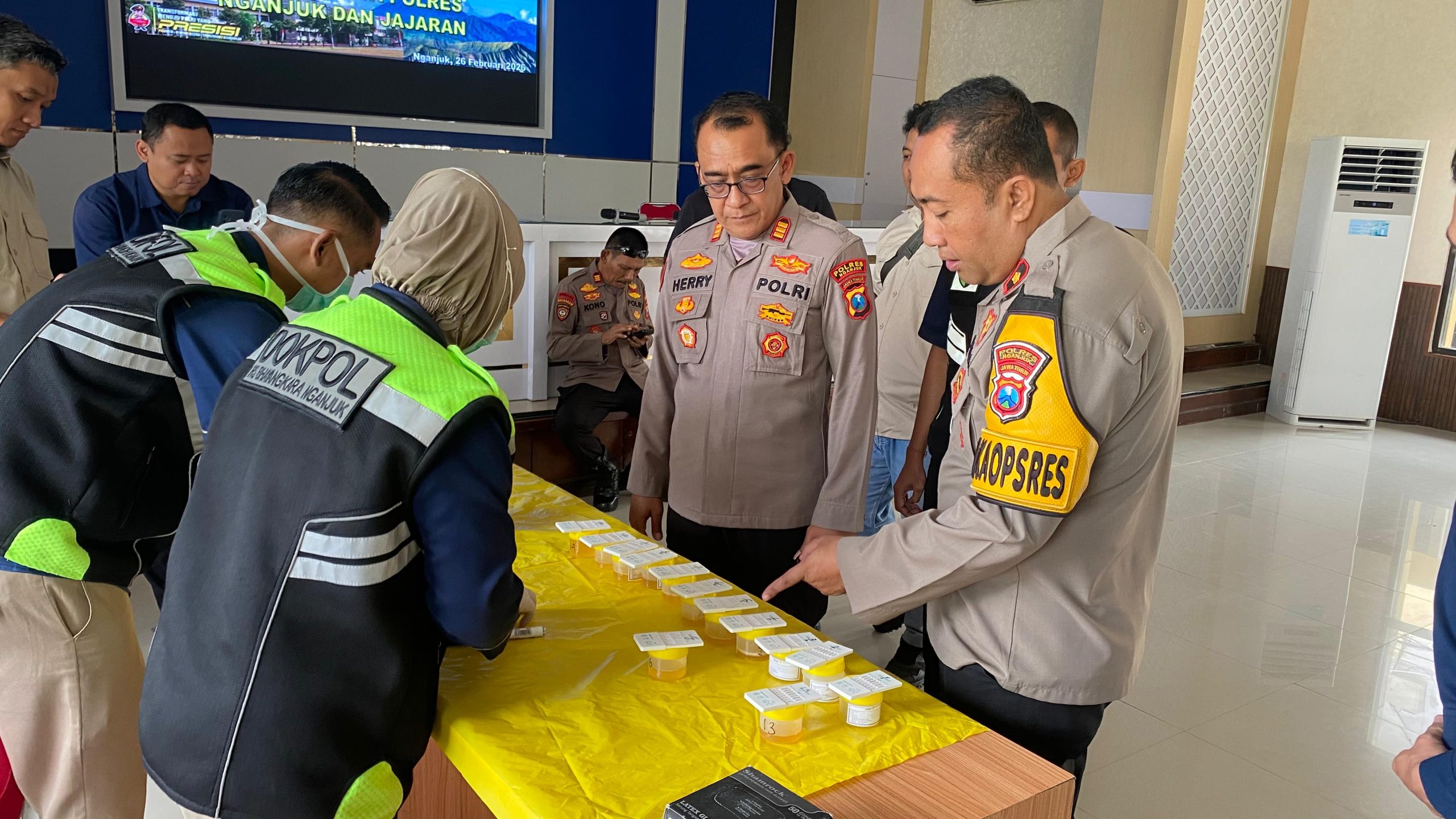 Polres Nganjuk menggelar pemeriksaan urin terhadap puluhan personel Polres dan Polsek jajaran, khususnya anggota yang melaksanakan tugas operasional di lapangan. Kegiatan yang dilaksanakan sebagai tindak lanjut instruksi langsung Kapolri dalam rangka memberantas peredaran narkoba di lingkungan Polri ini berlangsung pada Kamis (26/2/2026).