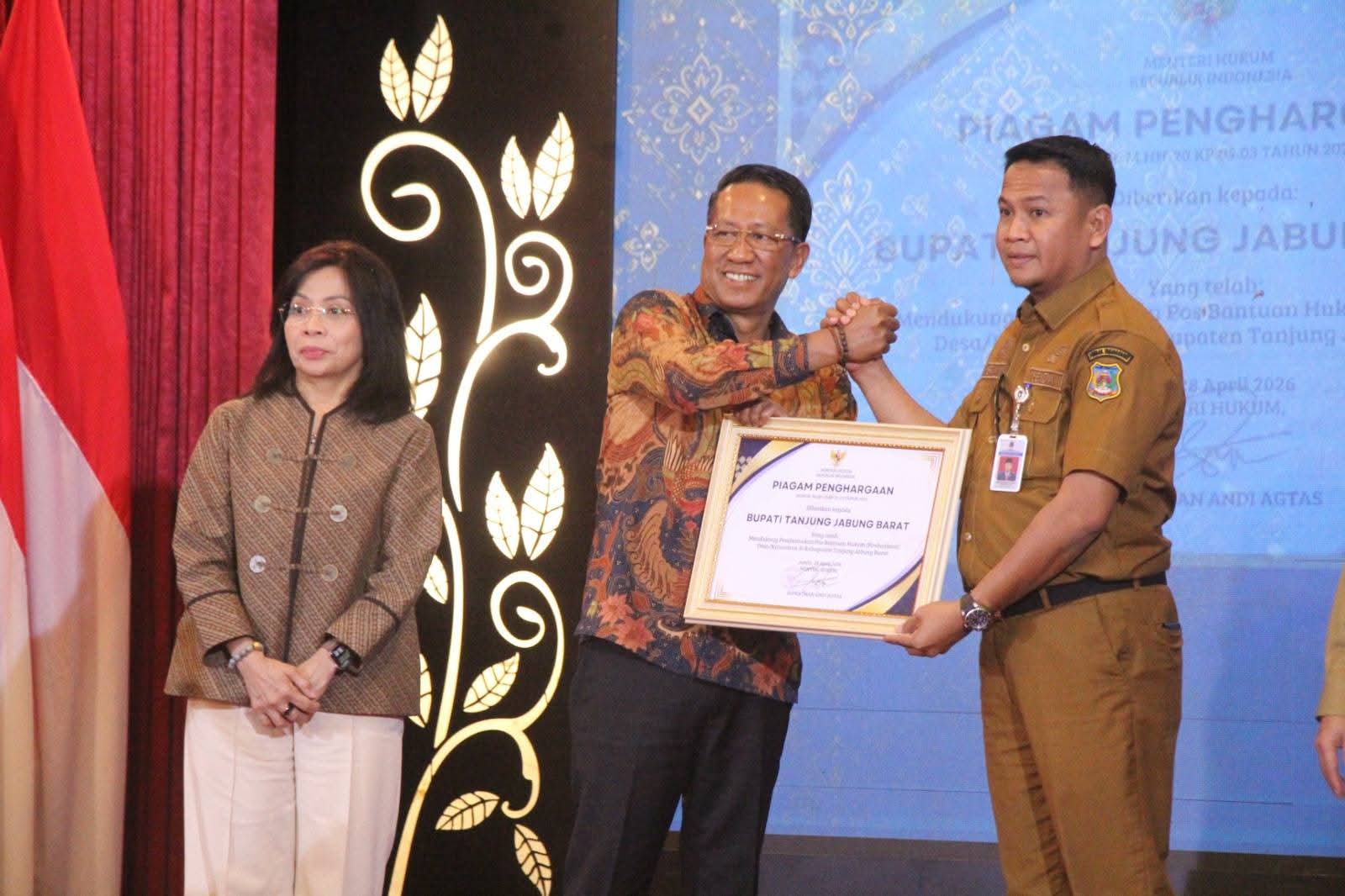 Dalam kesempatan tersebut, Pemerintah Kabupaten Tanjung Jabung Barat turut menerima penghargaan atas keberhasilan membentuk Posbankum di seluruh desa dan kelurahan. Capaian ini menjadi bukti komitmen daerah dalam mendukung program nasional.