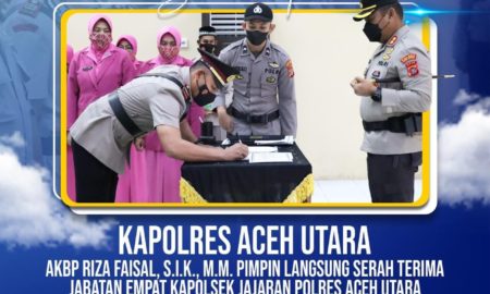 ACEH – PERSBHAYANGKARA.ID Kapolres Aceh Utara AKBP Riza Faisal, S.I.K., M.M., pimpin upacara serah terima jabatan (sertijab) Kapolsek Tanah pasir, Kapolsek Matang...