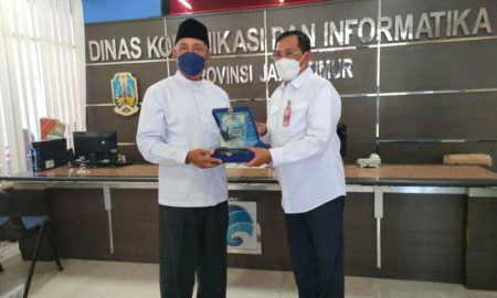 SURABAYA – persbhayangkara.id JAWA TIMUR Kepala Dinas Kominfo Provinsi Jatim, Dr. Hudiyono, M.Si (kanan) menyerahkan plakat Diskominfo kepada Ketua Kwarda GP Prov....