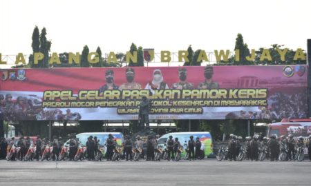 SURABAYA – persbhayangkara.id JAWA TIMUR Apel gelar pasukan Pemor Keris (Patroli Bermotor Penegakan Protokol Kesehatan Masyarakat) di Lapangan Makodam V/Brawijaya, Senin (24/1/2022)....
