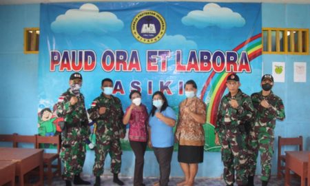 BOVEN DIGOEL – persbhayangkara.id PAPUA Prajurit TNI Satgas Pamtas RI-PNG Yonif 410/Alugoro melaksanakan kegiatan membagikan buku perlengkapan sekolah kepada siswa PAUD Ora...